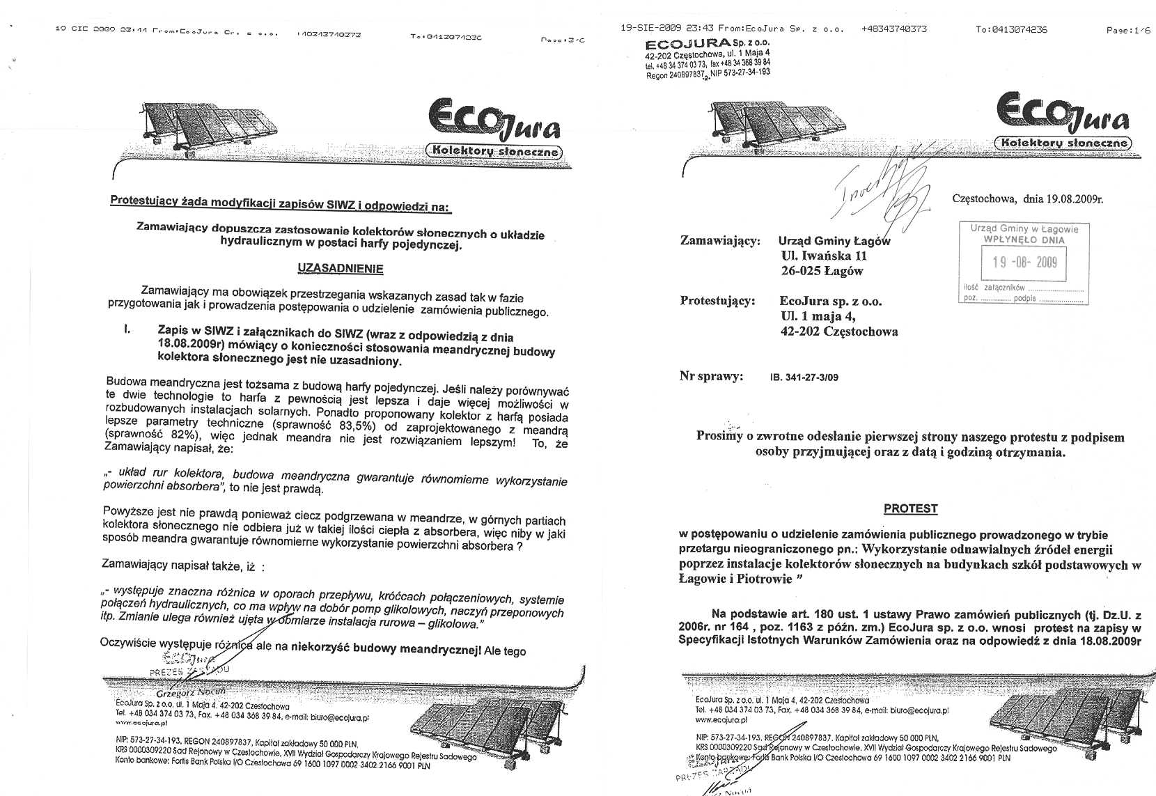 | Informacja o proteście na zadaniu „Wykorzystanie odnawialnych źródeł energii poprzez instalacje kolektorów słonecznych na budynkach szkół podstawowych w łagowie i Piotrowie” | 2009-08-20 |
